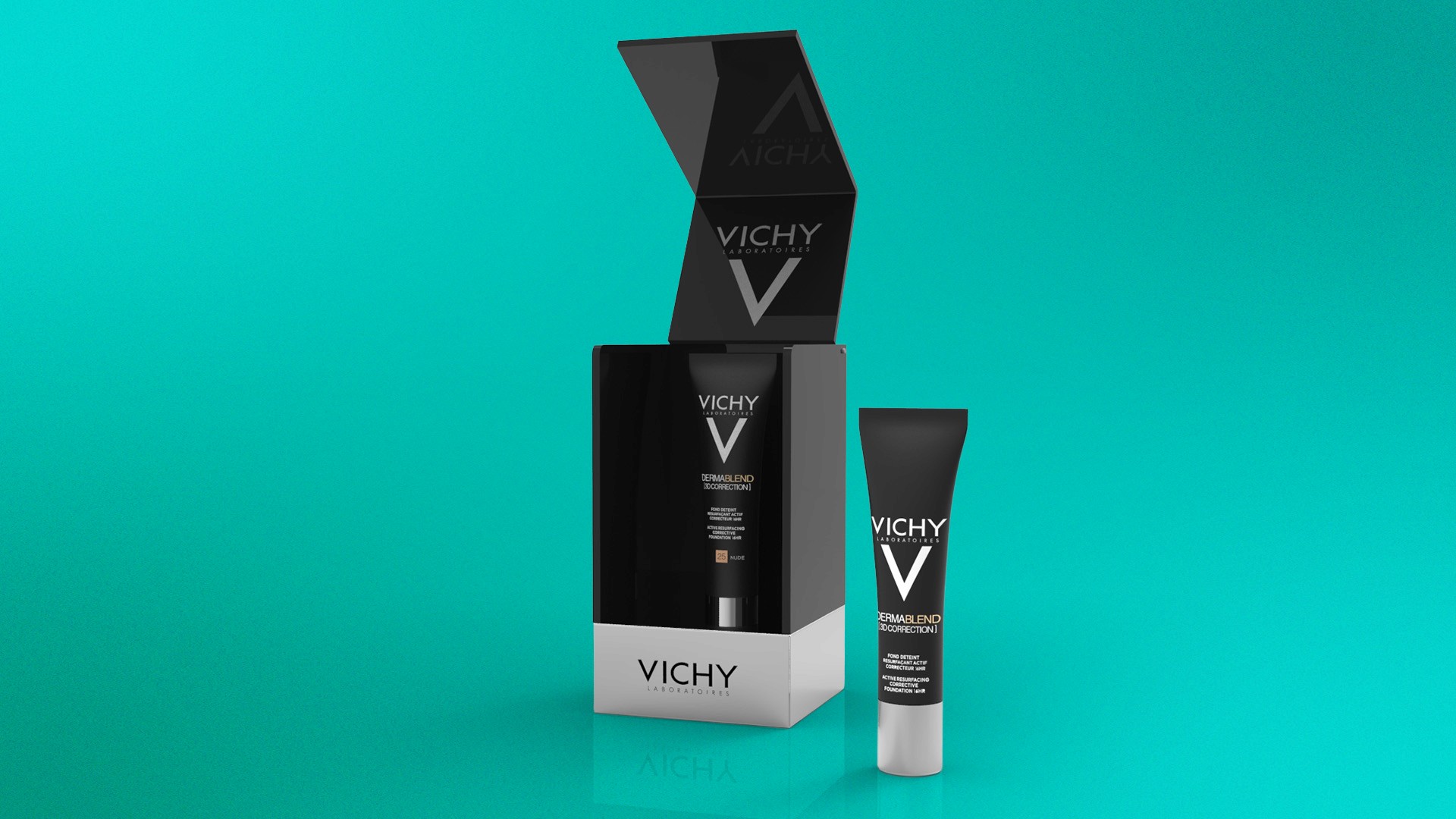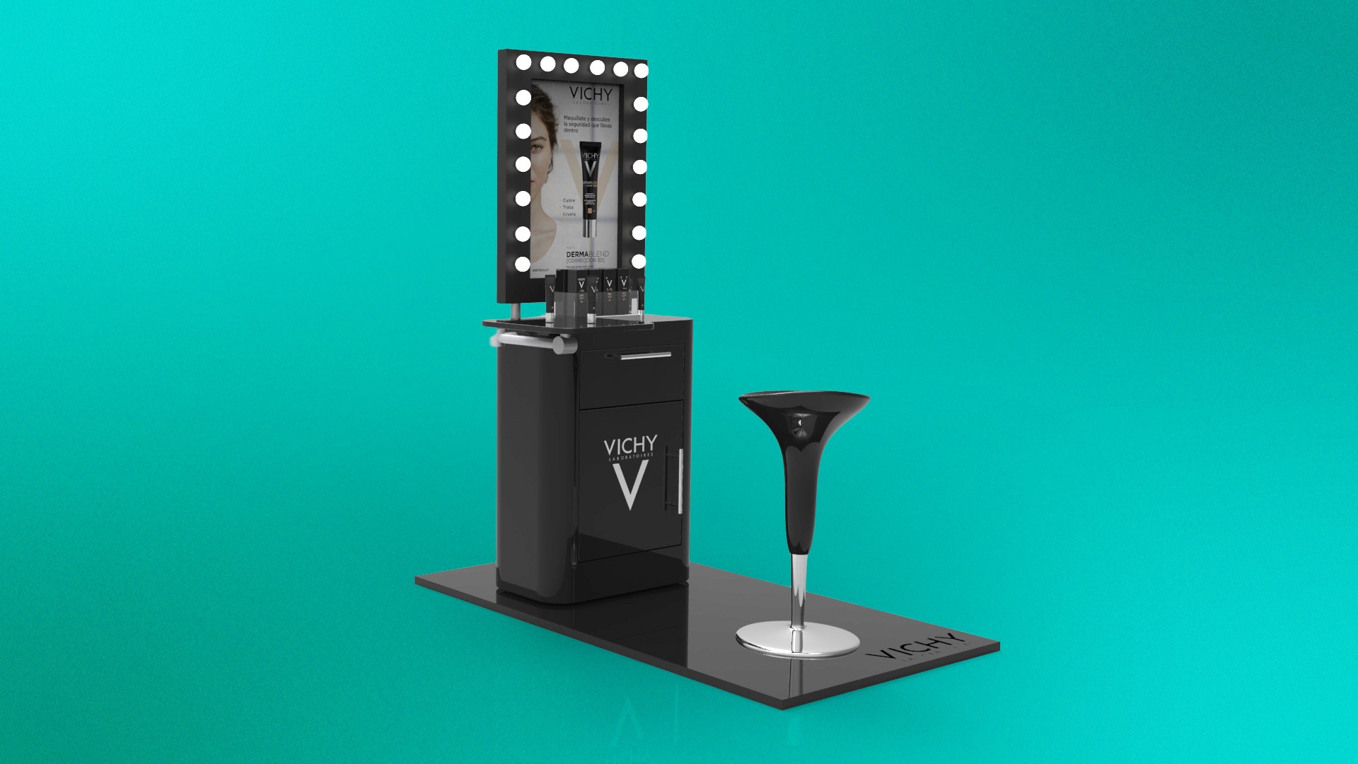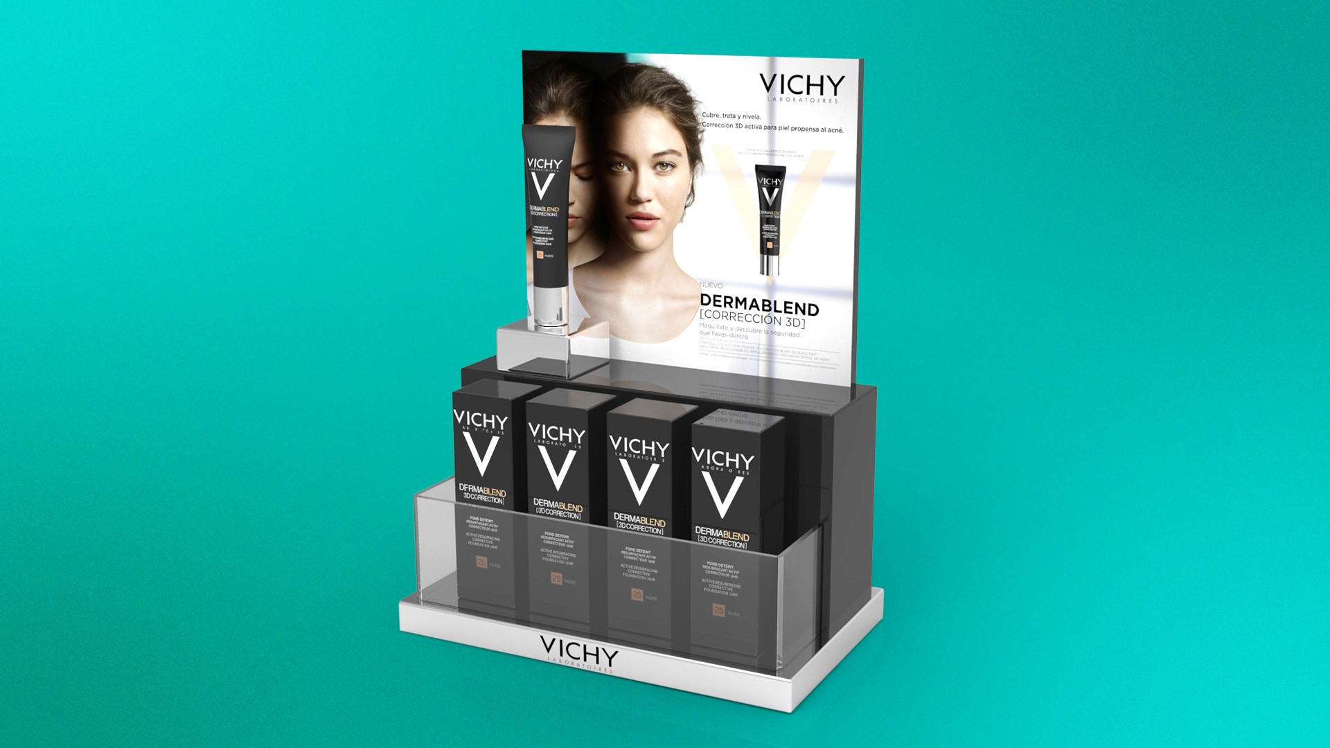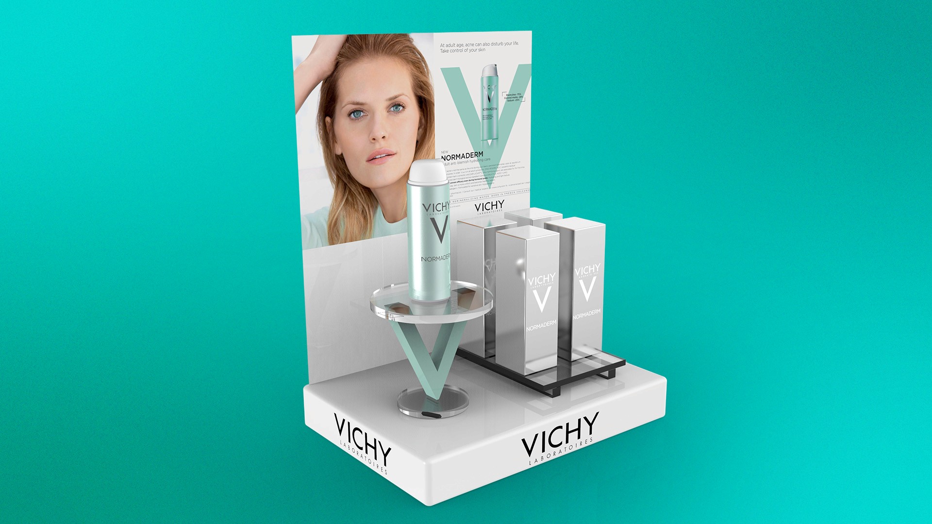 Modeled exhibition setups for the Normaderm line, combining packaging redesign with digital display integration. Visualizations for marketing presentations and product displays.