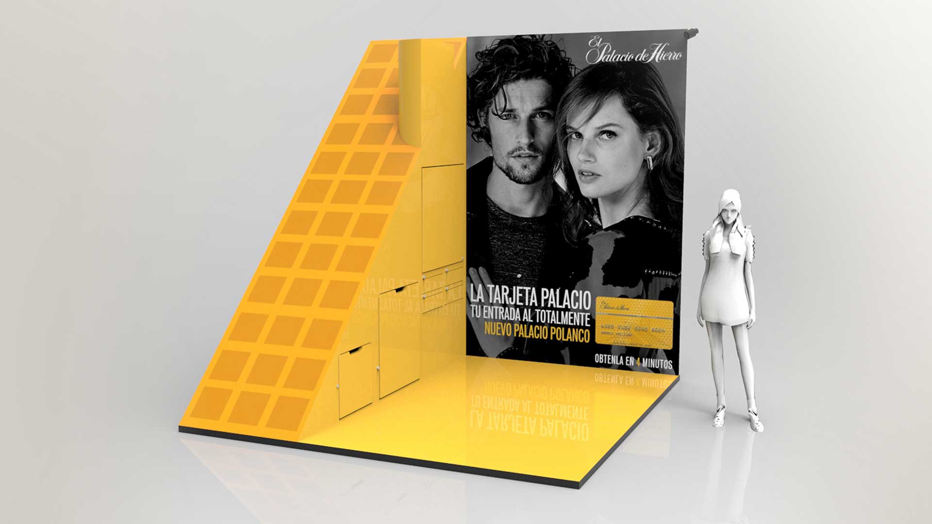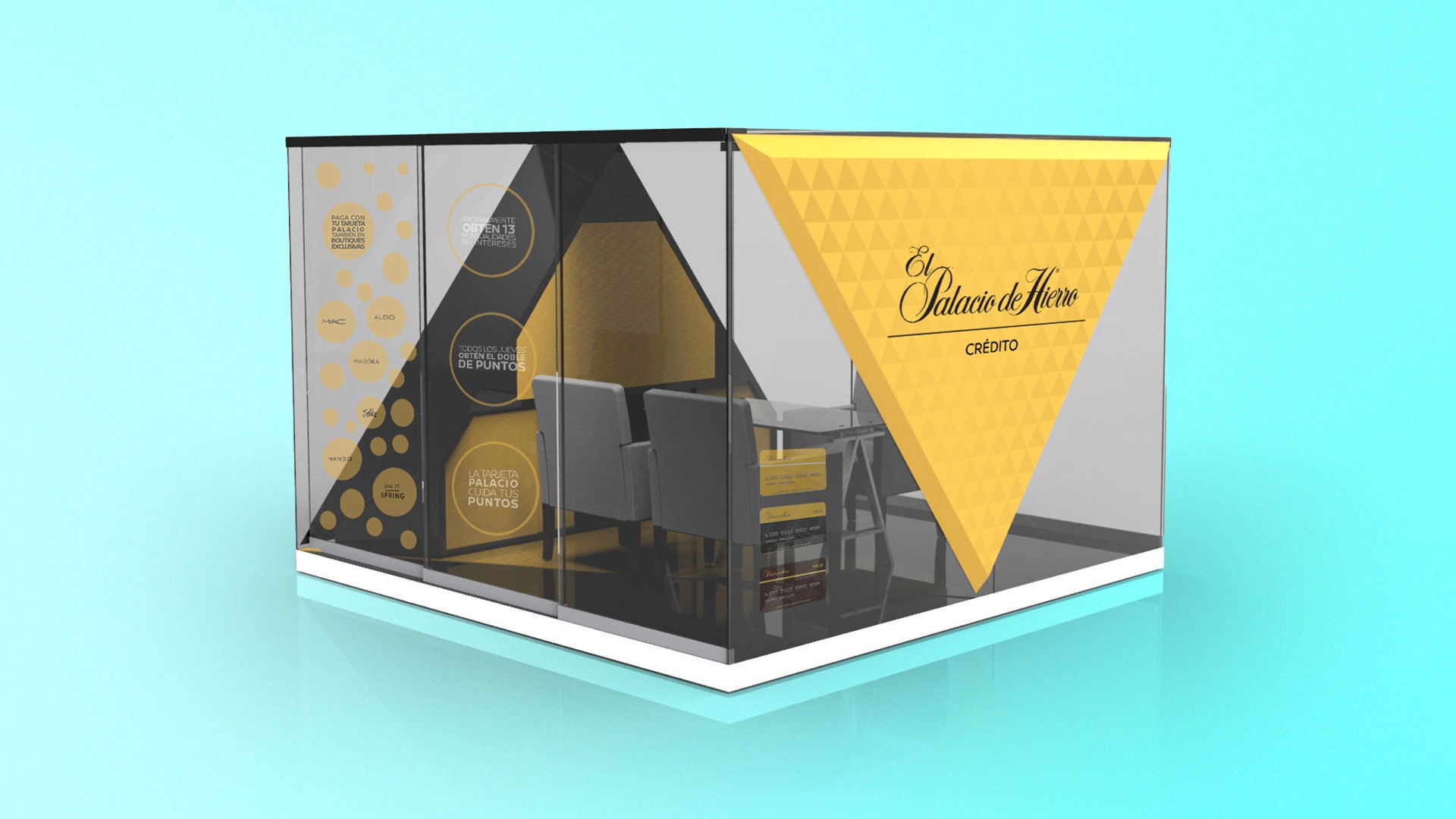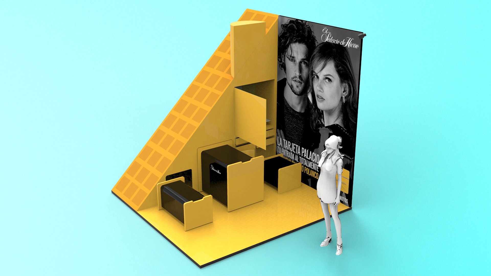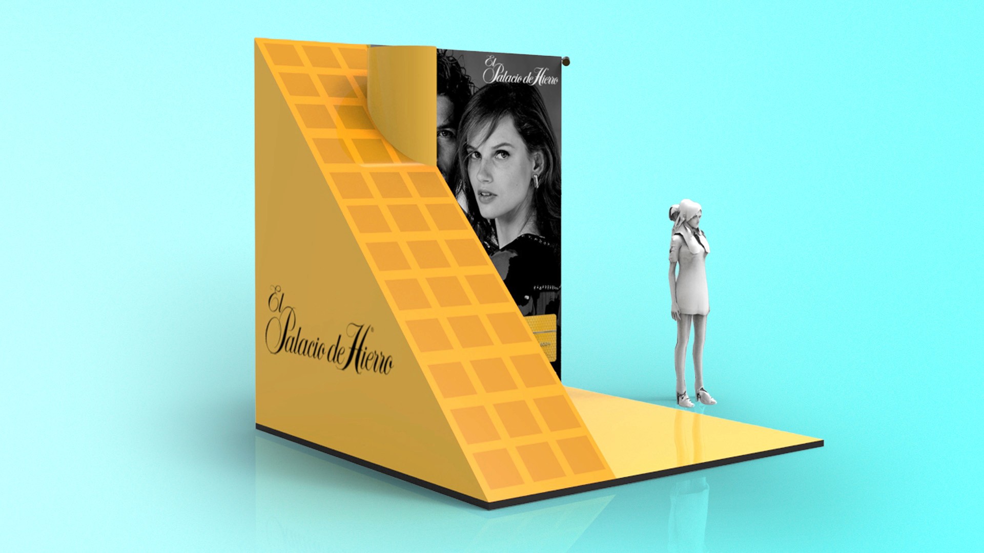 Developed high-end mall displays and portable promotional units, including geometric showcases and branded carts, reflecting Palacio de Hierro’s refined and modern aesthetic. 3D renders by Juan Carlos Catano.