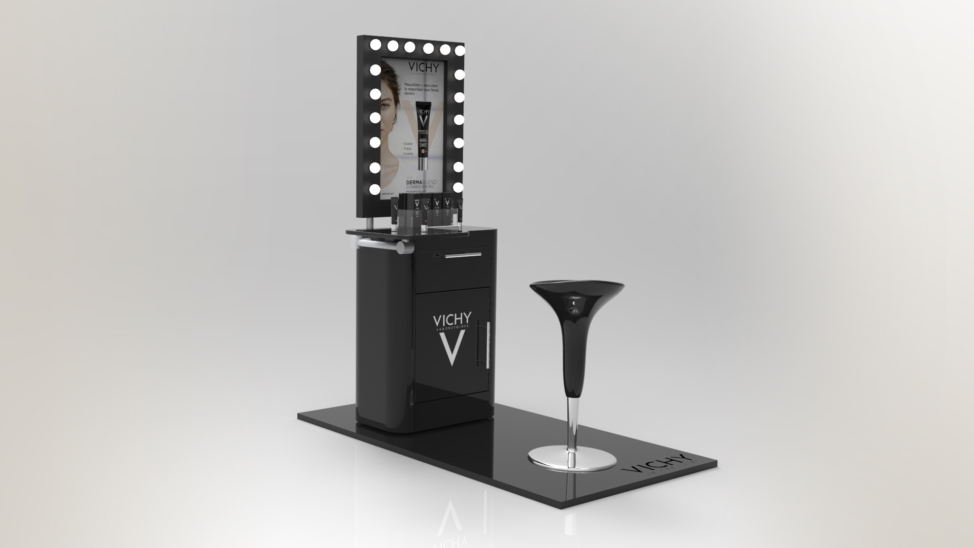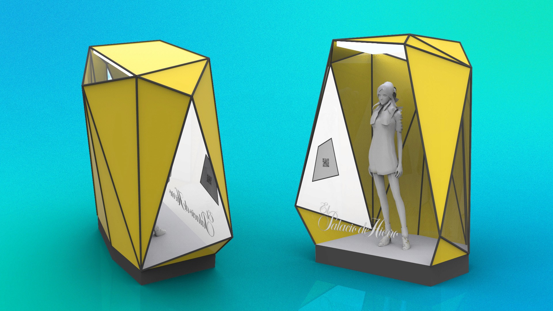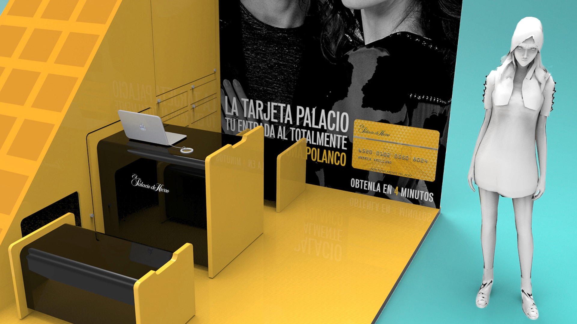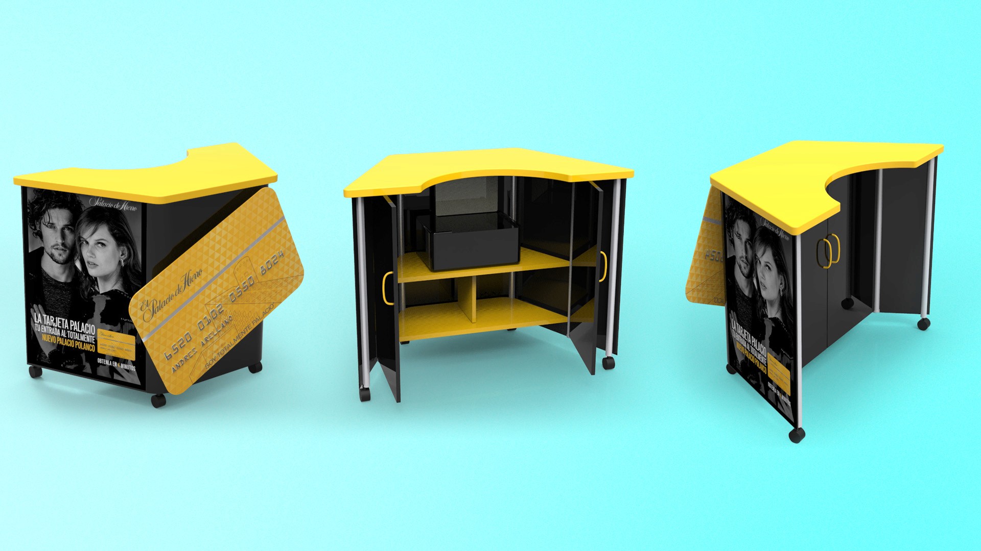 Developed high-end mall displays and portable promotional units, including geometric showcases and branded carts, reflecting Palacio de Hierro’s refined and modern aesthetic. 3D renders by Juan Carlos Catano.