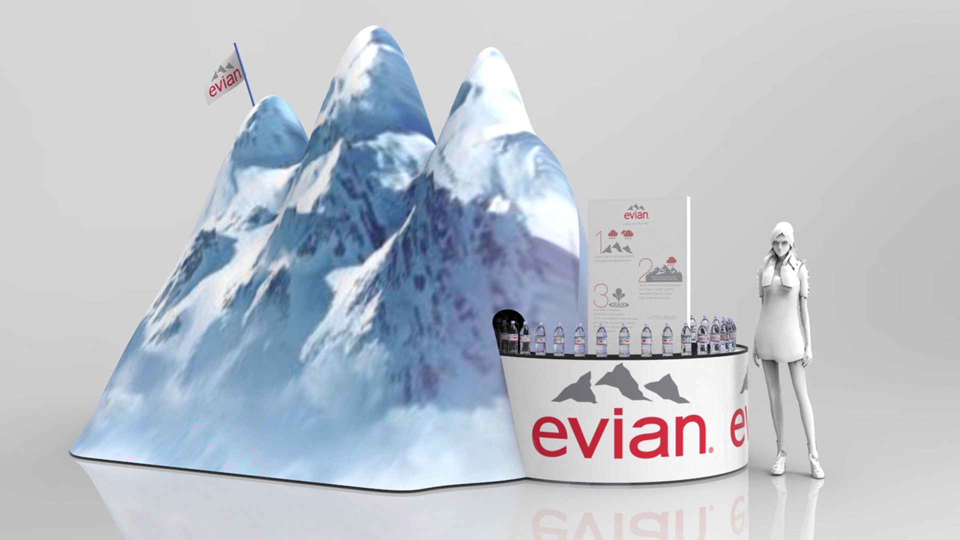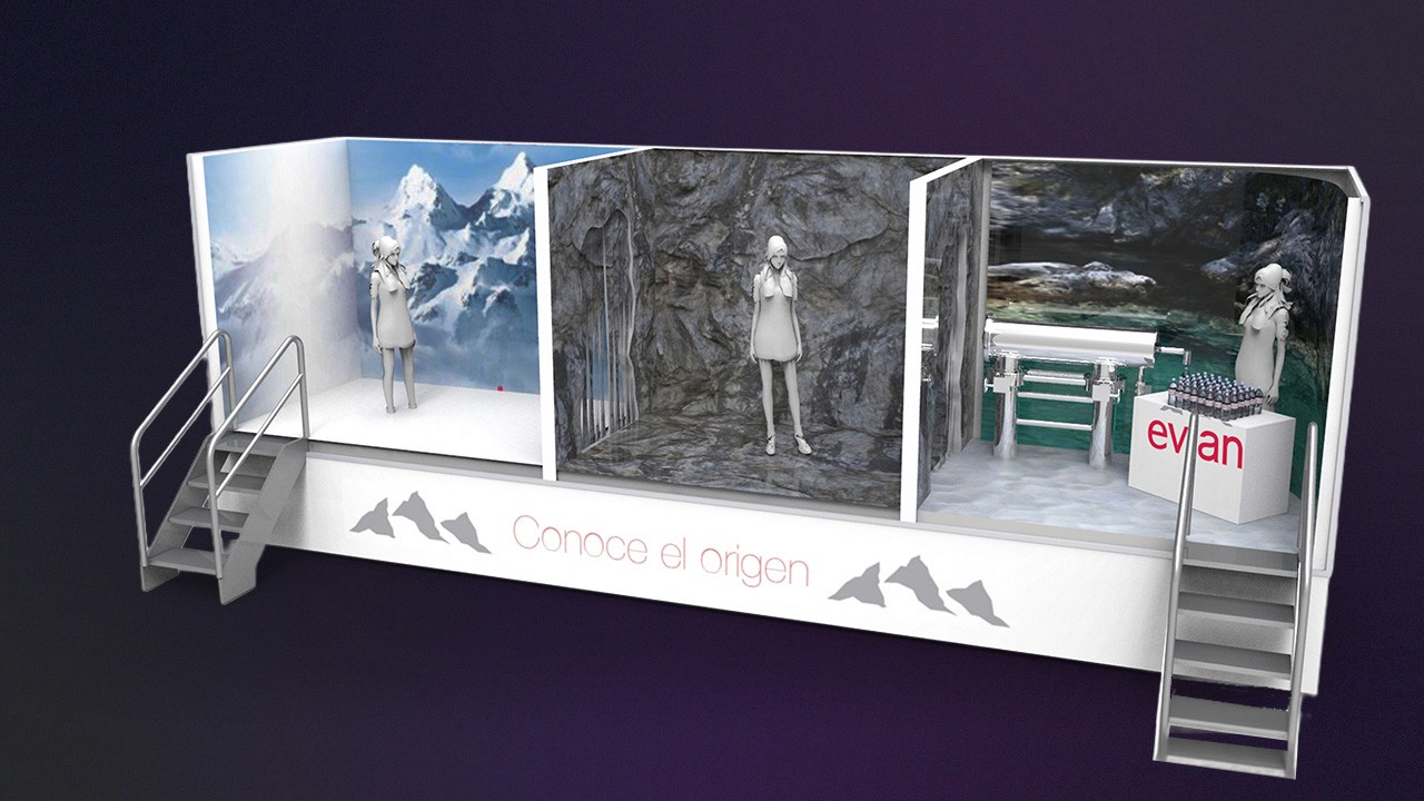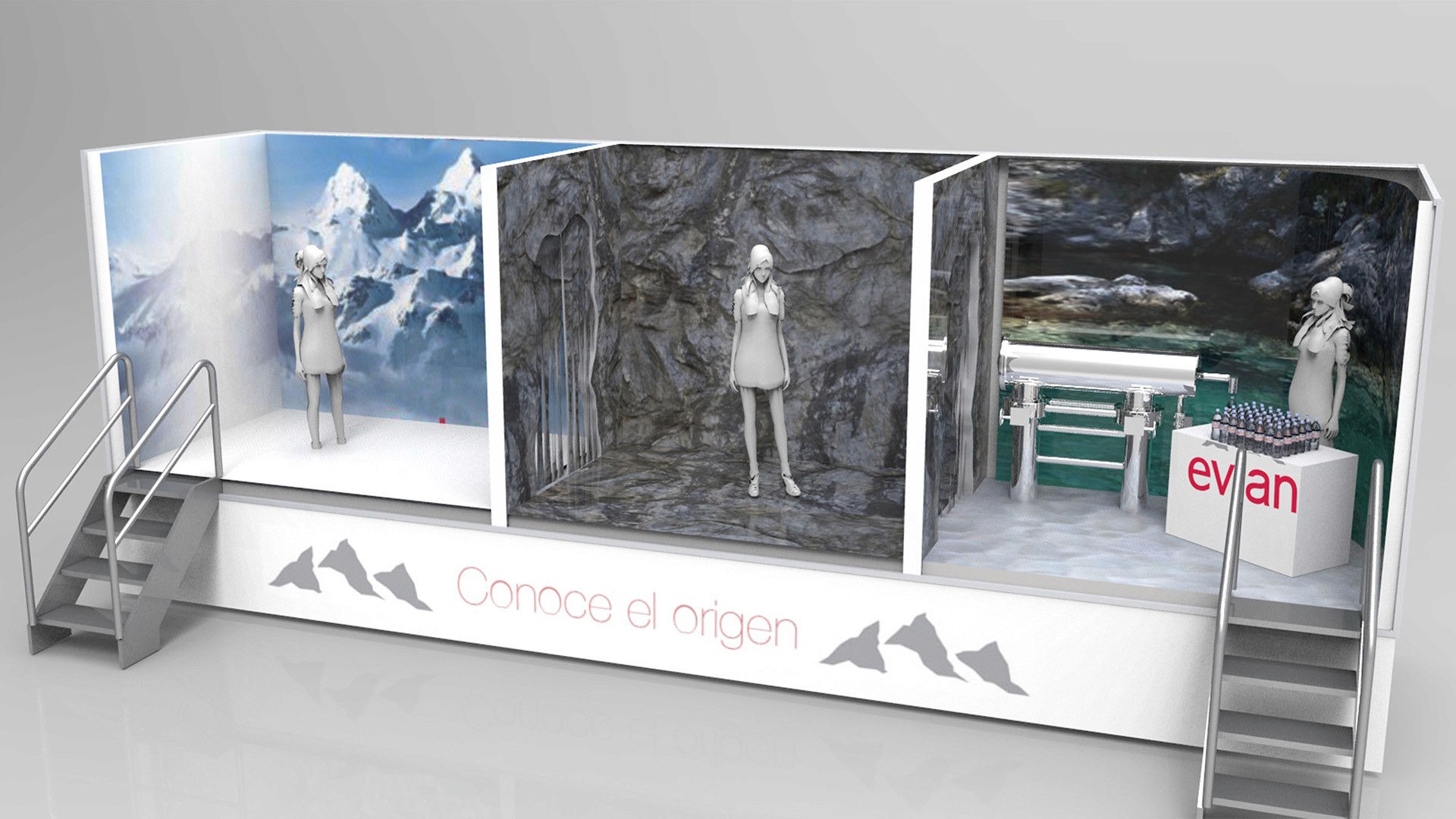 Developed a pop-up truck and multi-sensory display titled “Discover the Origin", recreating the journey of Evian water from alpine source to bottle through immersive 3D environments. Renders by Juan Carlos Catano.