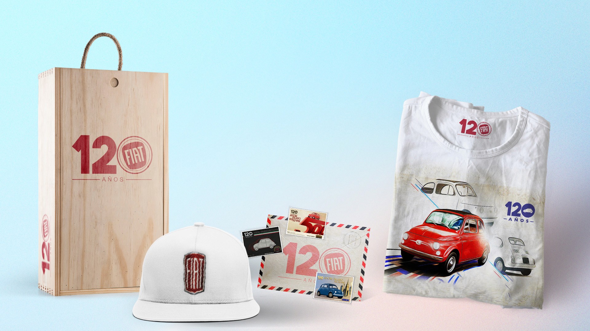 To bring the anniversary to life offline, a limited-edition collector’s kit was created. The set included apparel, stationery, and keepsakes that mixed retro design with tactile finishes — turning FIAT’s history into tangible brand storytelling.