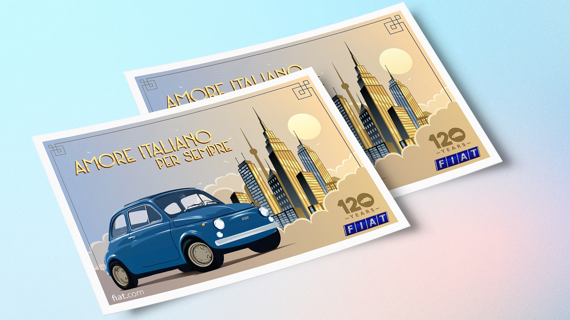 A series of collectible postcards were designed for the anniversary campaign, inspired by mid-century Italian posters. The color palette and geometry evoked vintage travel ads, celebrating FIAT’s cultural influence and joyful design language.