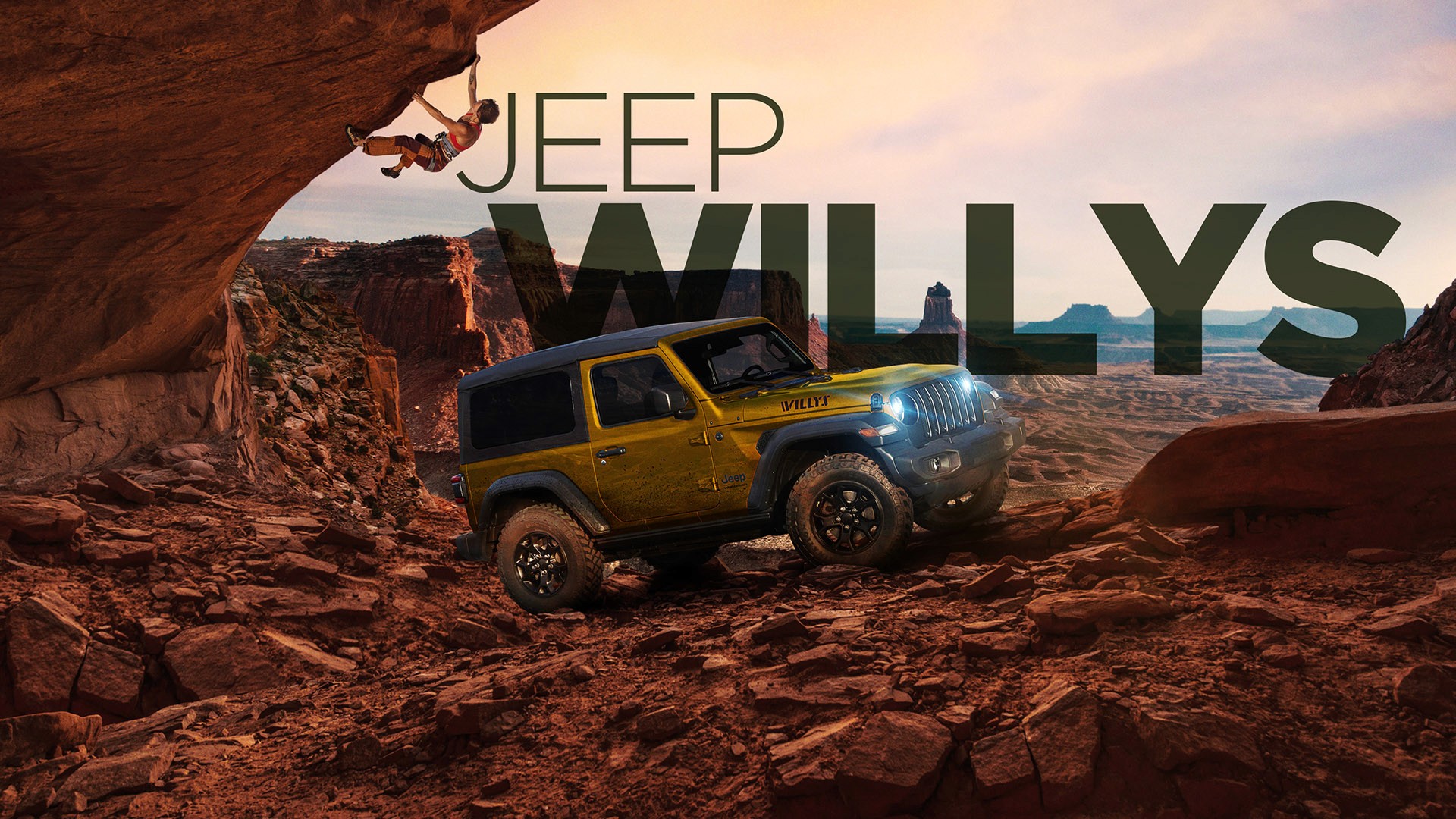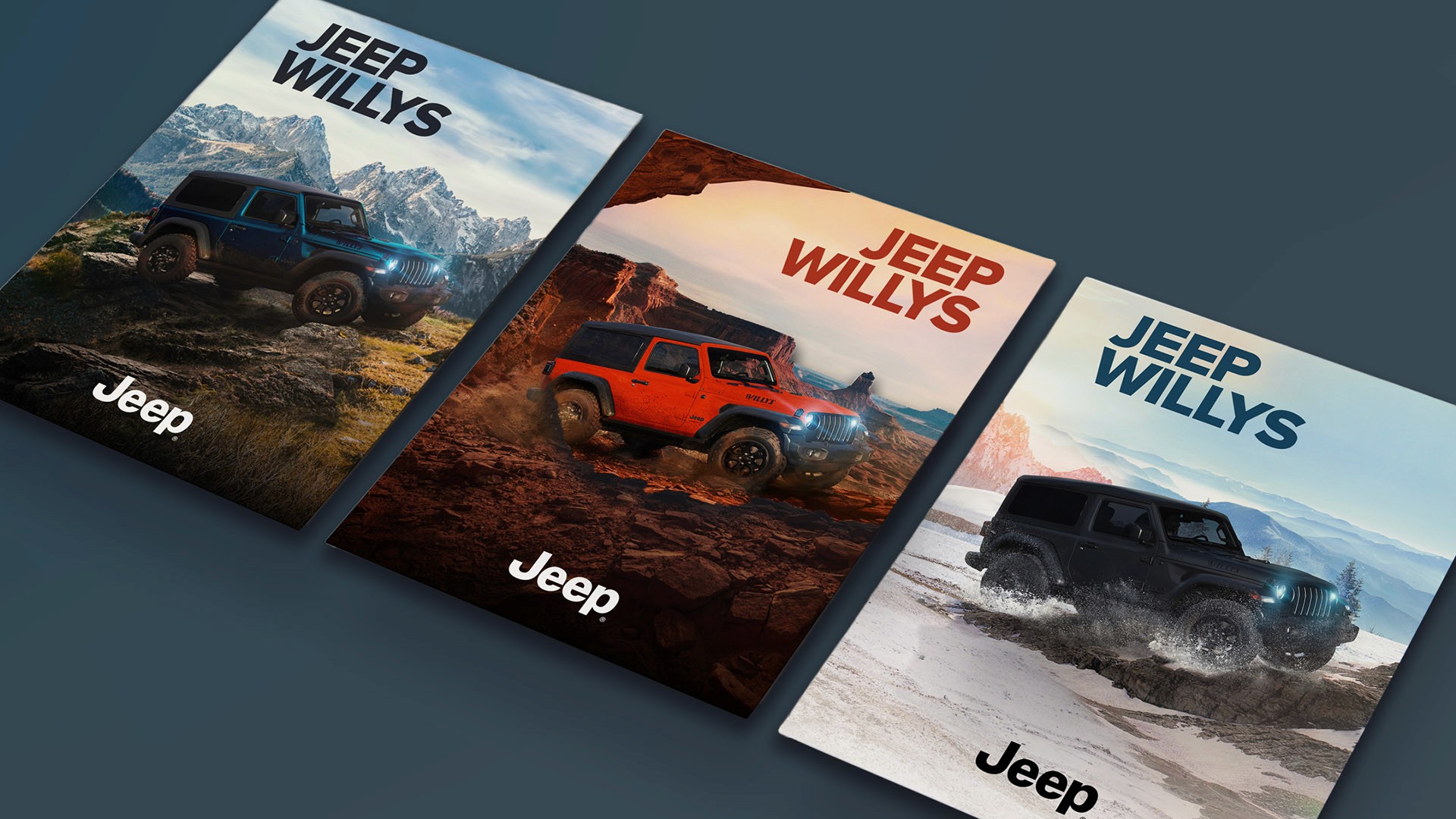Subway and magazine ads highlighting the Jeep Willys in desert and mountain terrains.