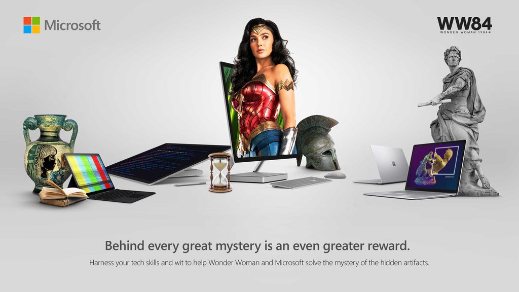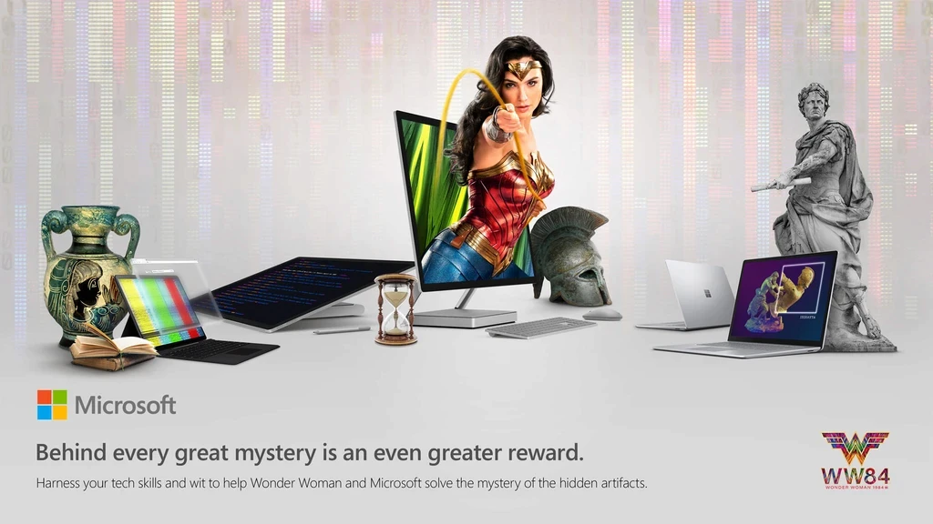 The master graphics established the visual tone for all global campaign materials — from social banners to the official microsite and hero visuals. Each composition merged WW84’s retro-futuristic energy with Microsoft’s clean, minimalist aesthetic. Digital retouching was done manually (pre-AI), ensuring a consistent cinematic quality across all composited elements: Wonder Woman’s armor, classical artifacts, and Microsoft devices. Lighting, reflections, and color grading were meticulously balanced to create depth and realism while maintaining the brand’s precision and polish.