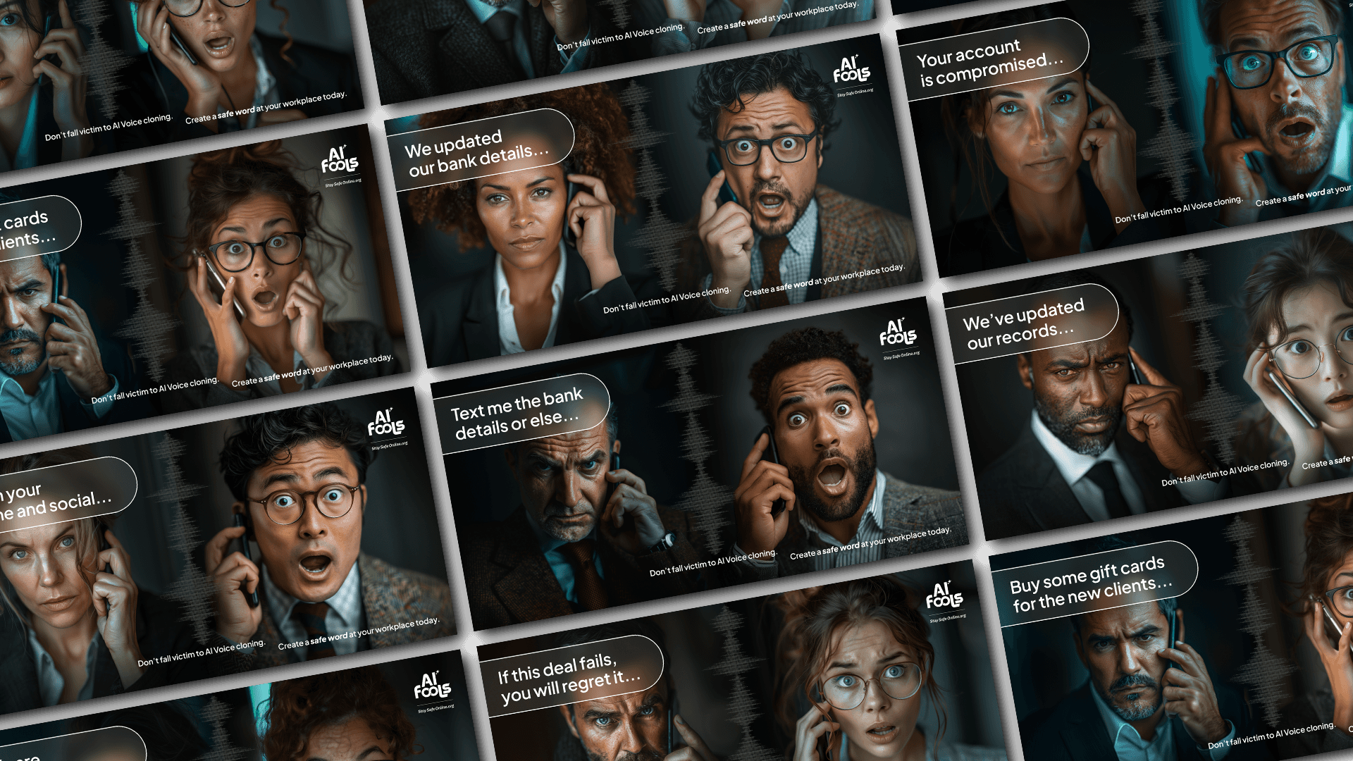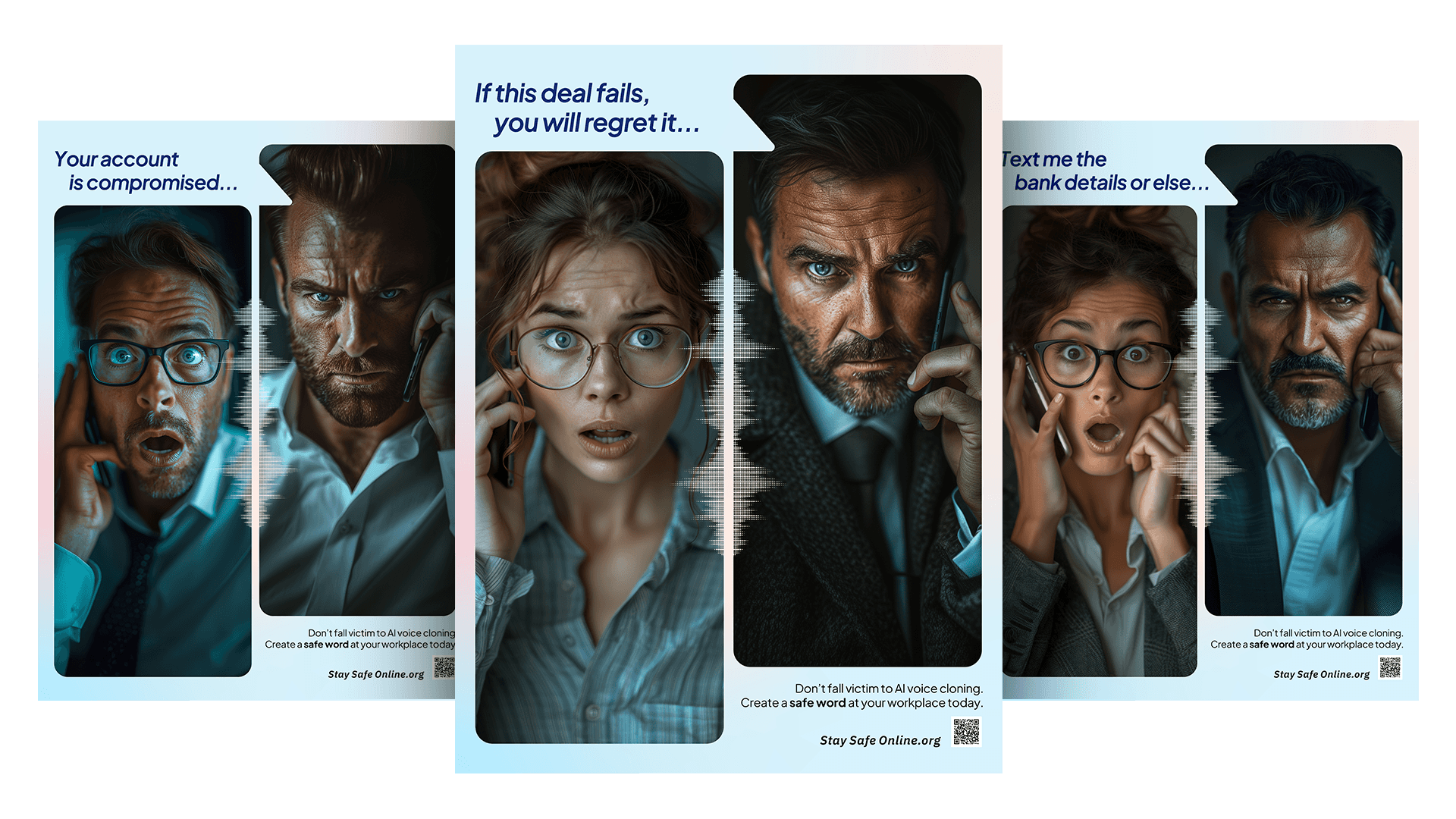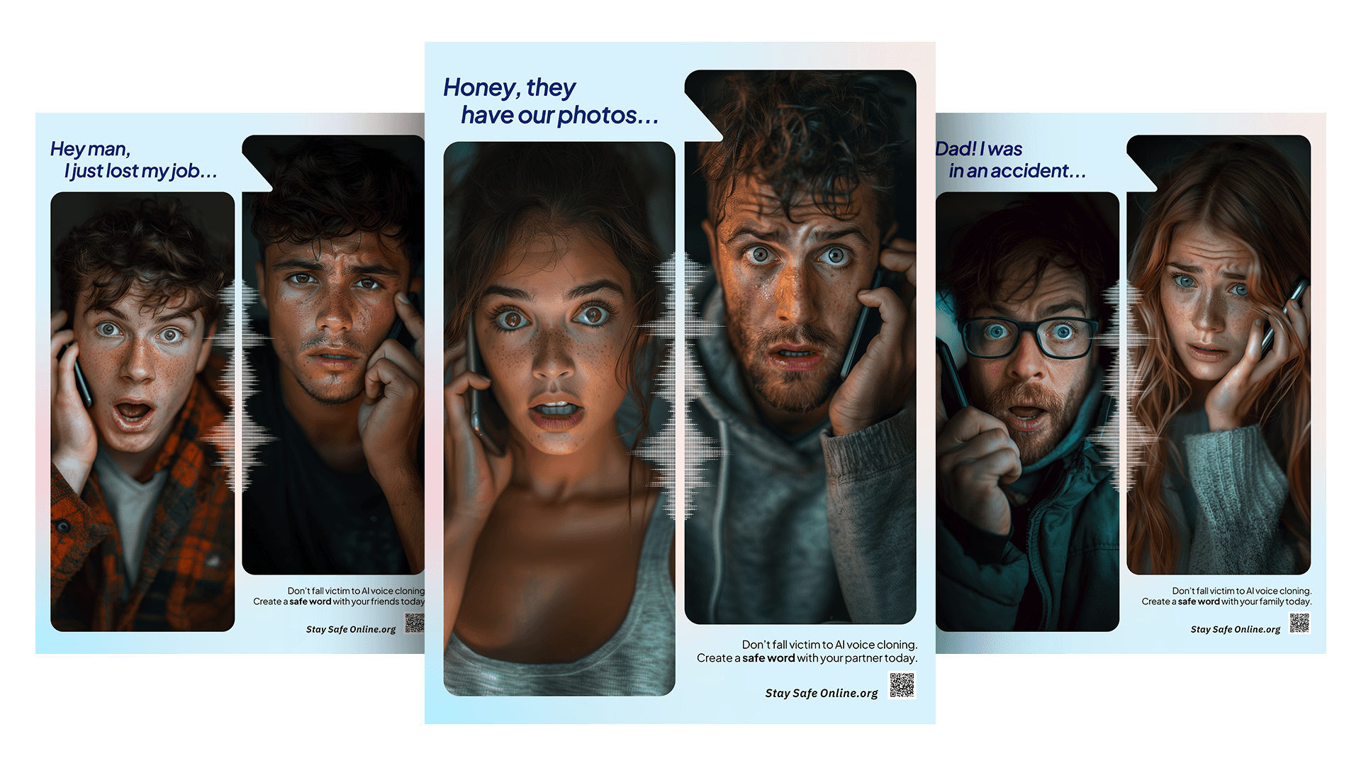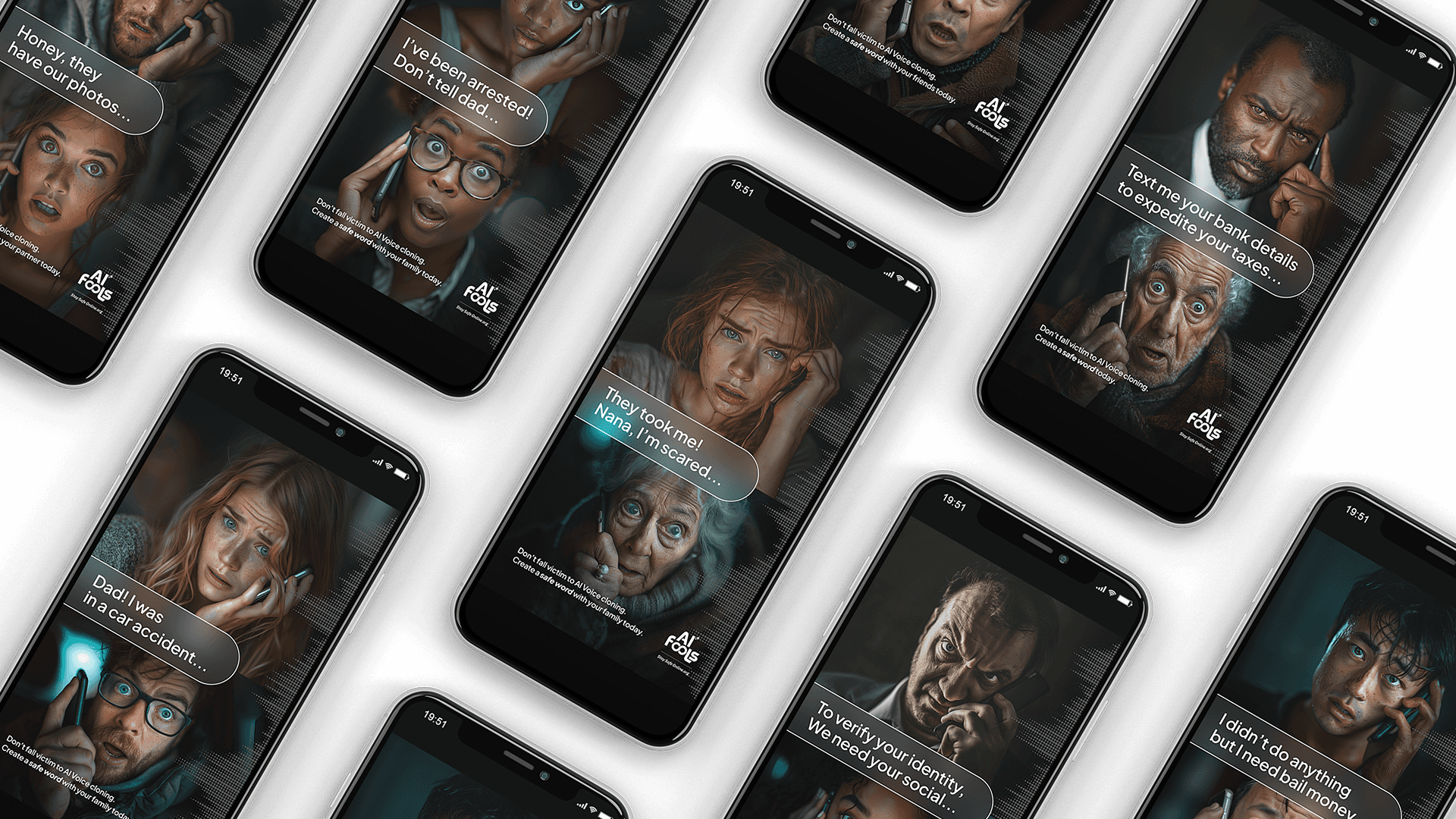 This nationwide campaign tackled the rising threat of AI-generated voice scams. The creative direction focused on emotional realism — showing the shock and confusion of hearing a familiar voice that isn’t real. The visuals combined dramatic portraits with text messages from fake callers, paired with interactive web and social experiences that invited people to “listen and learn.”