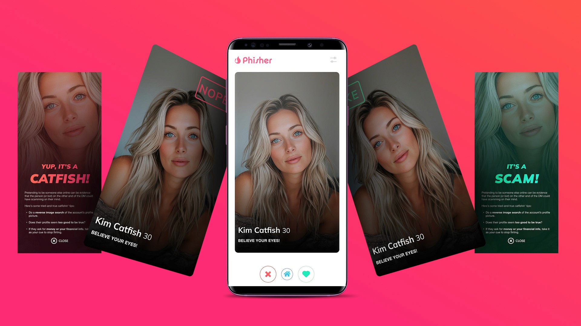 This playful campaign used dating-app culture to highlight how easily people can fall for online scams. We created a fake app prototype called Phisher that mimicked Tinder's swipe interface, revealing how scammers operate. The tone was fun and relatable at first glance — until users realized how real and common these tactics are.