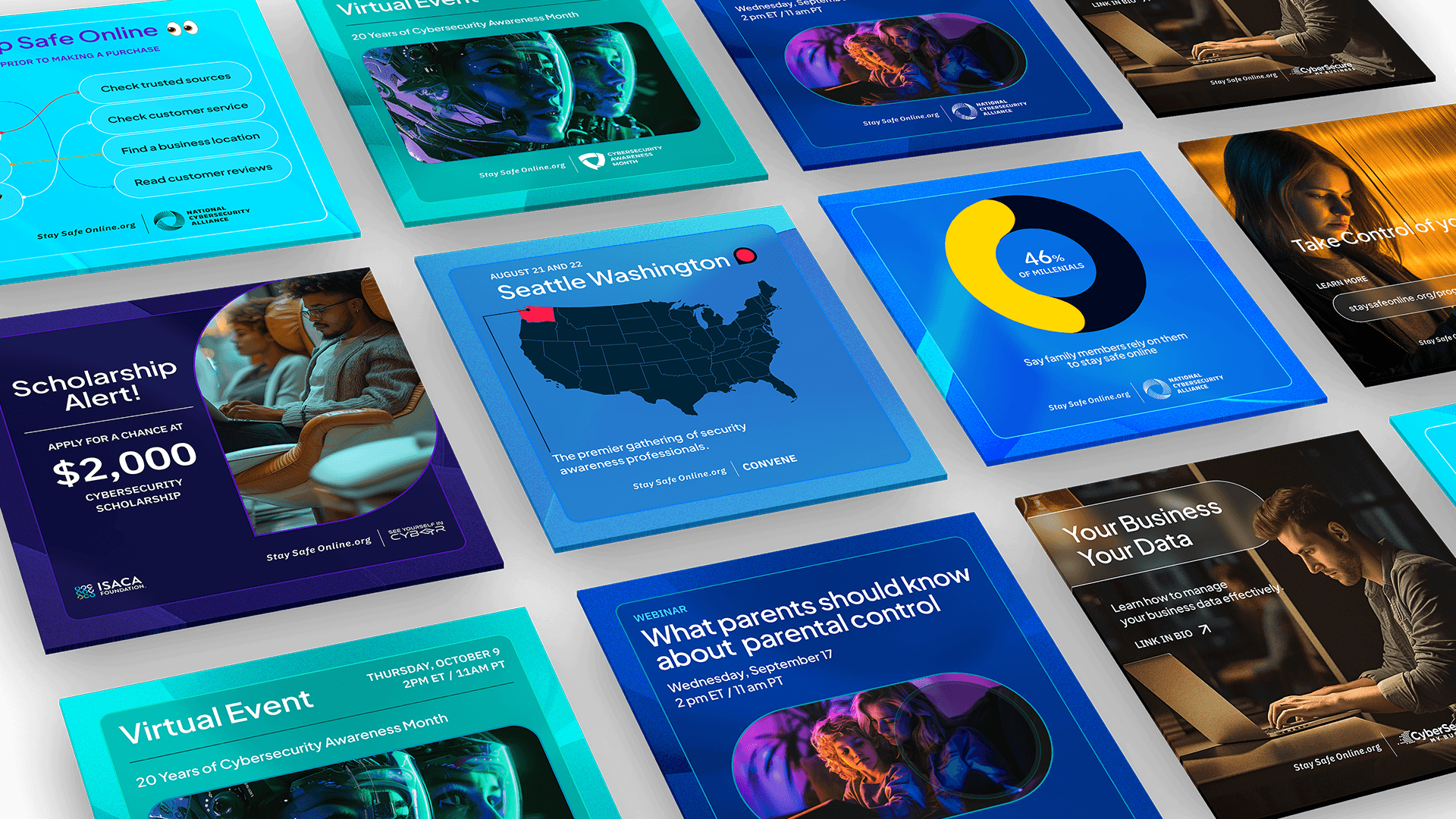 Working with the National Cybersecurity Alliance has been one of those projects where creativity and purpose meet. I’ve led the art direction and design across multiple campaigns, helping transform complex cybersecurity topics into visuals that are easy to understand and engaging for people of all ages. From rebranding and web design to social media, billboards, and animated stories, each campaign focused on empowering people to stay safe online — while keeping the messaging modern, relatable, and visually striking.