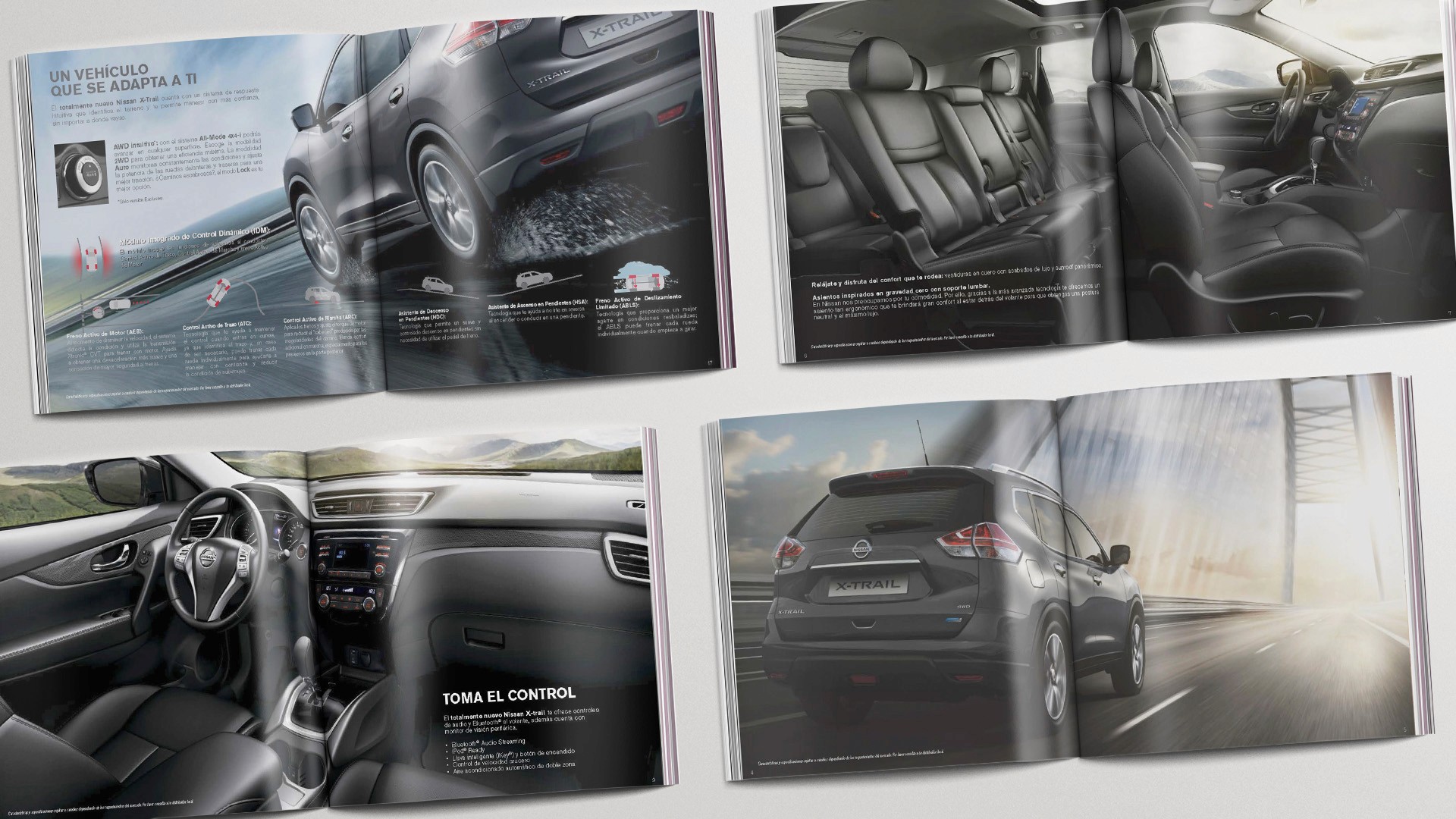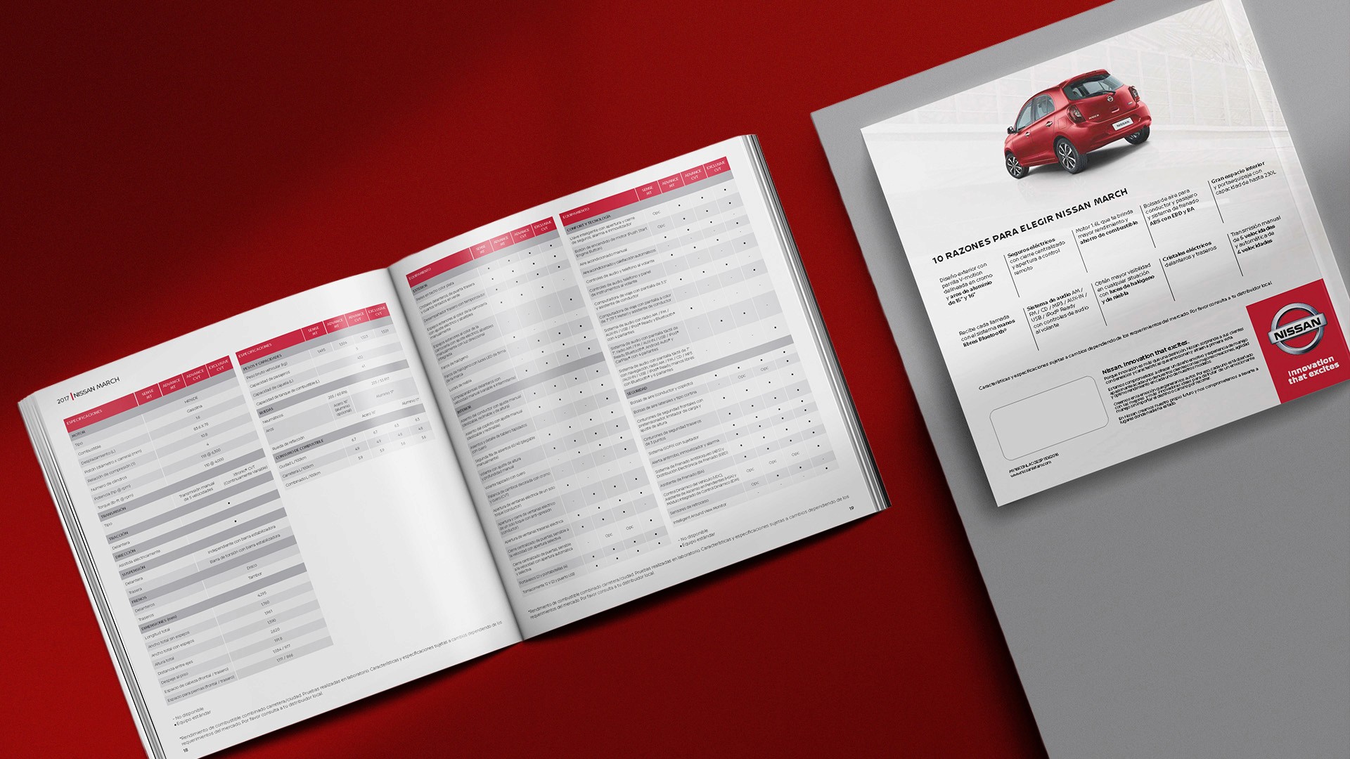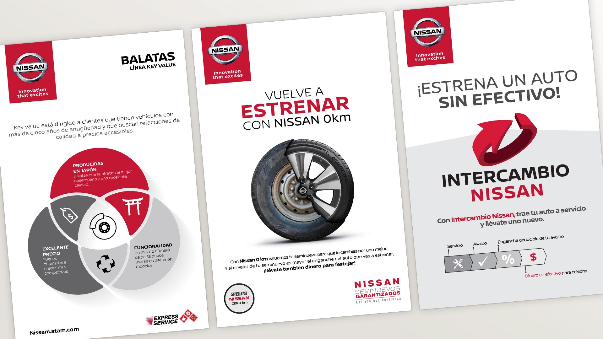 A variety of dealership materials and printed collateral designed to maintain a consistent look and feel across multiple Nissan lines.