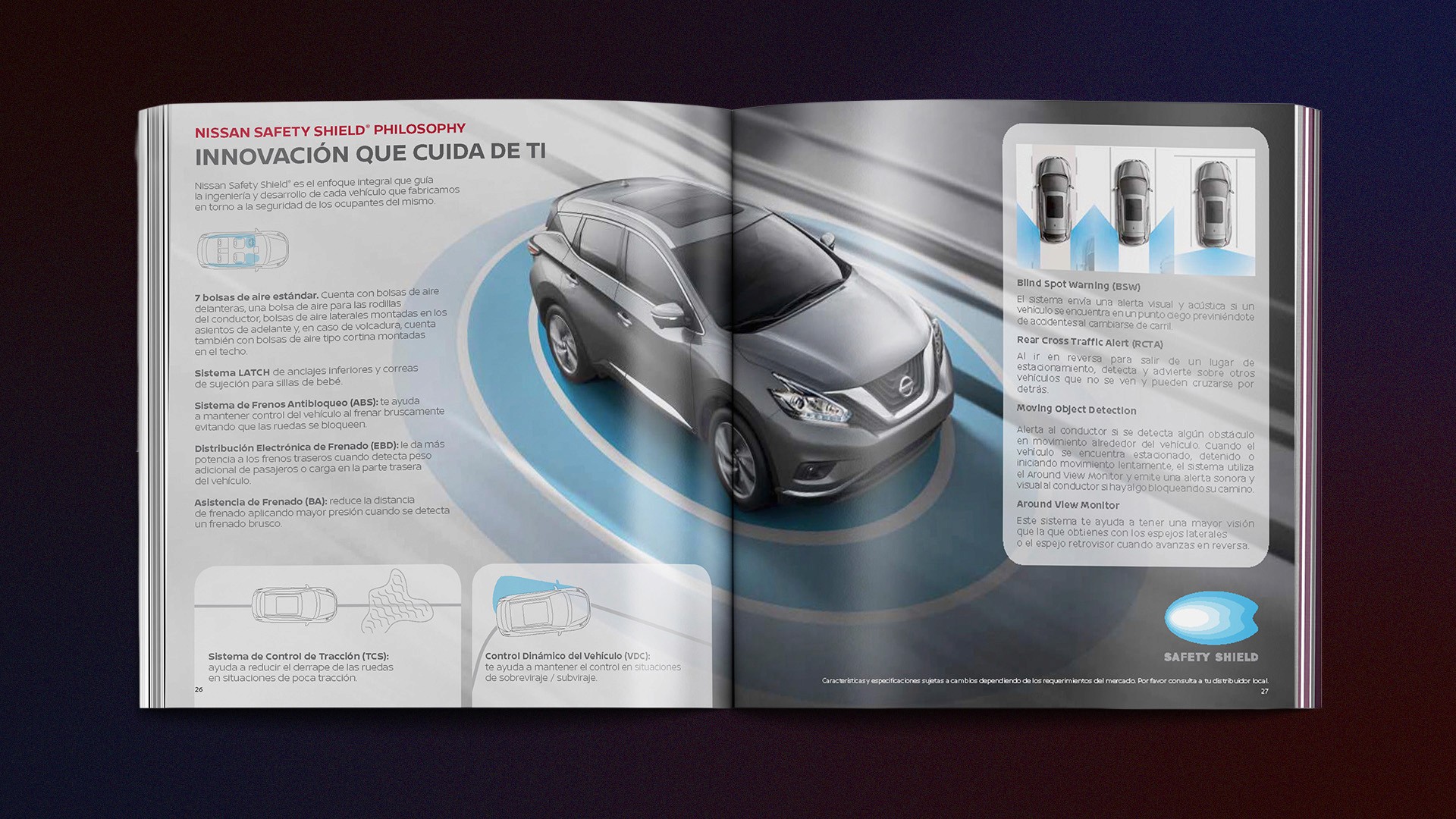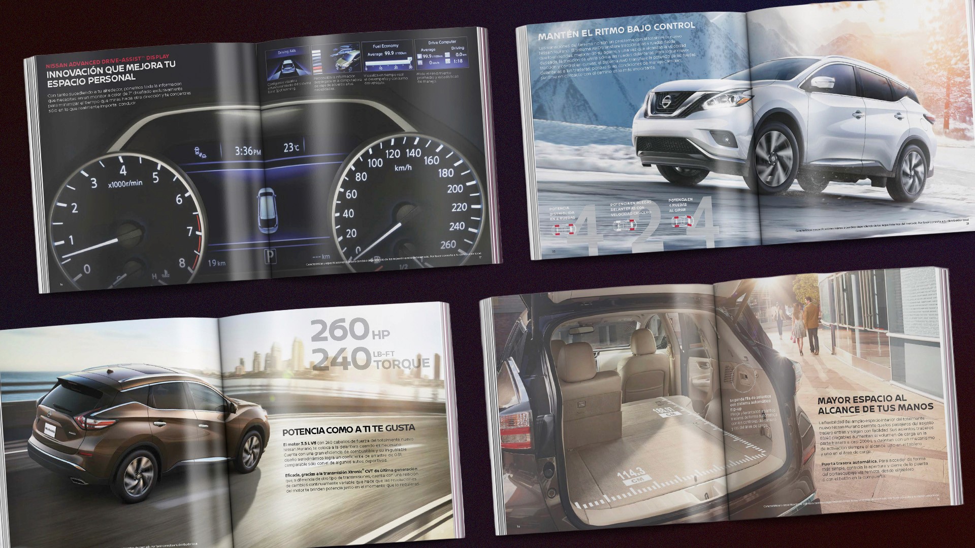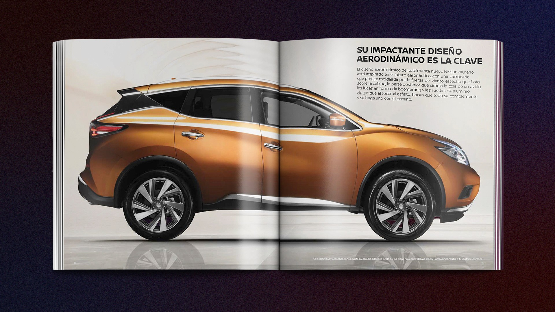 The Murano catalog was created to capture the car’s sculptural form and refined craftsmanship through elegant, editorial-style design. Every spread combined rich photography with clean typographic layouts and soft metallic tones that echoed the vehicle’s aesthetic. The goal was to make flipping through the catalog feel like experiencing the car itself — sophisticated, modern, and effortlessly premium.