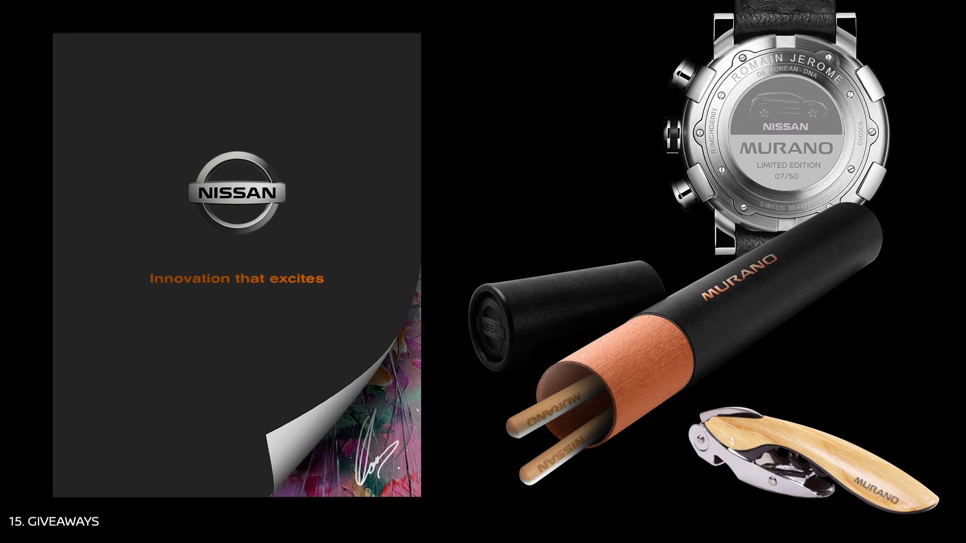 To unveil the new Murano, we designed an immersive event inspired by the car’s copper accents and architectural curves. The experience blended warm metallic textures, curated lighting, and refined digital interactions — from chauffeur notifications to branded keepsakes. It was less about spectacle and more about feeling — a seamless expression of Murano’s understated luxury and innovation.
