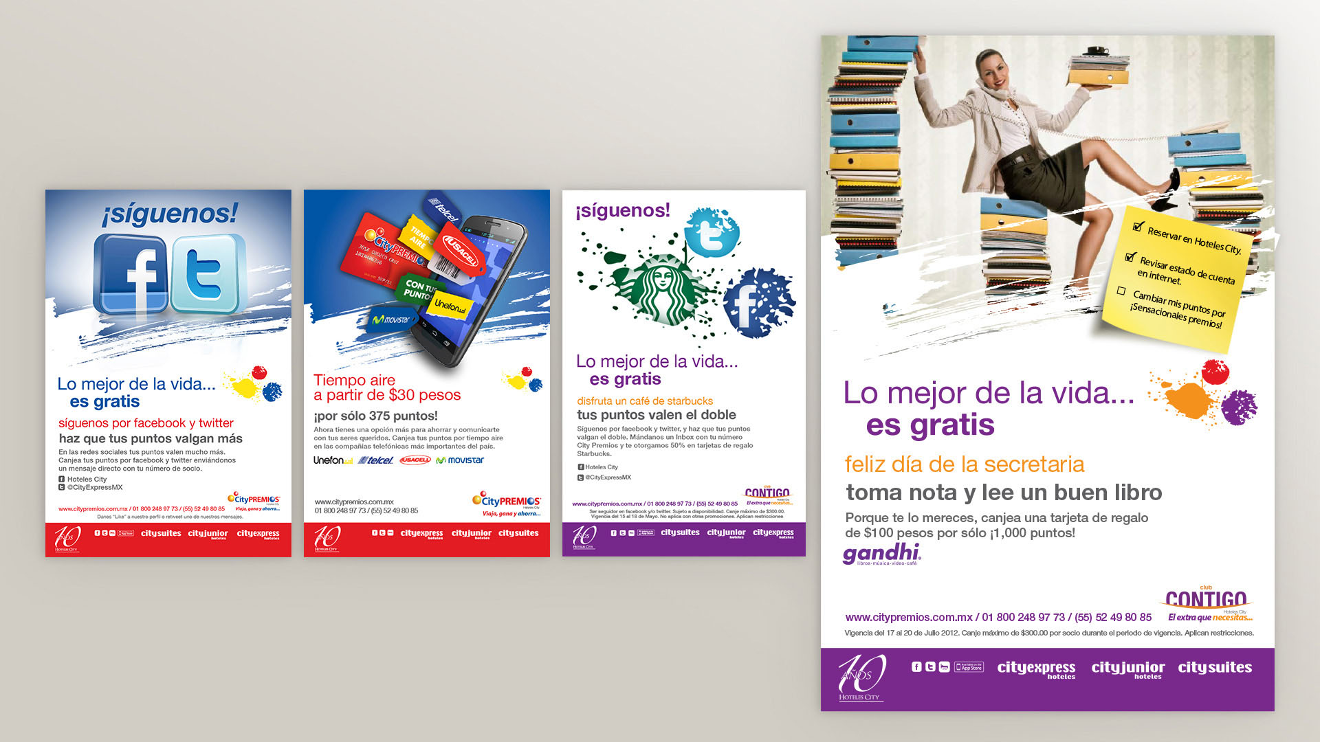 Led the creative development of CityPremios, the hotels’ loyalty and rewards program. Work included UX/UI for the web portal, membership card design, print and digital promotions, and advertising collateral across CityExpress, CitySuites, and CityJunior.