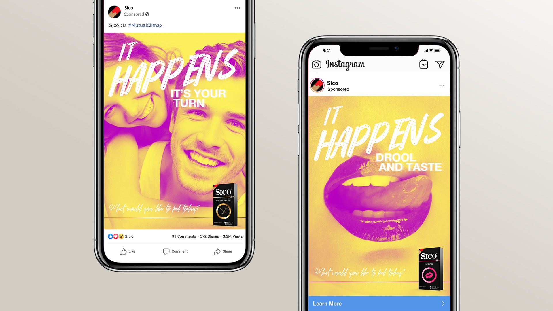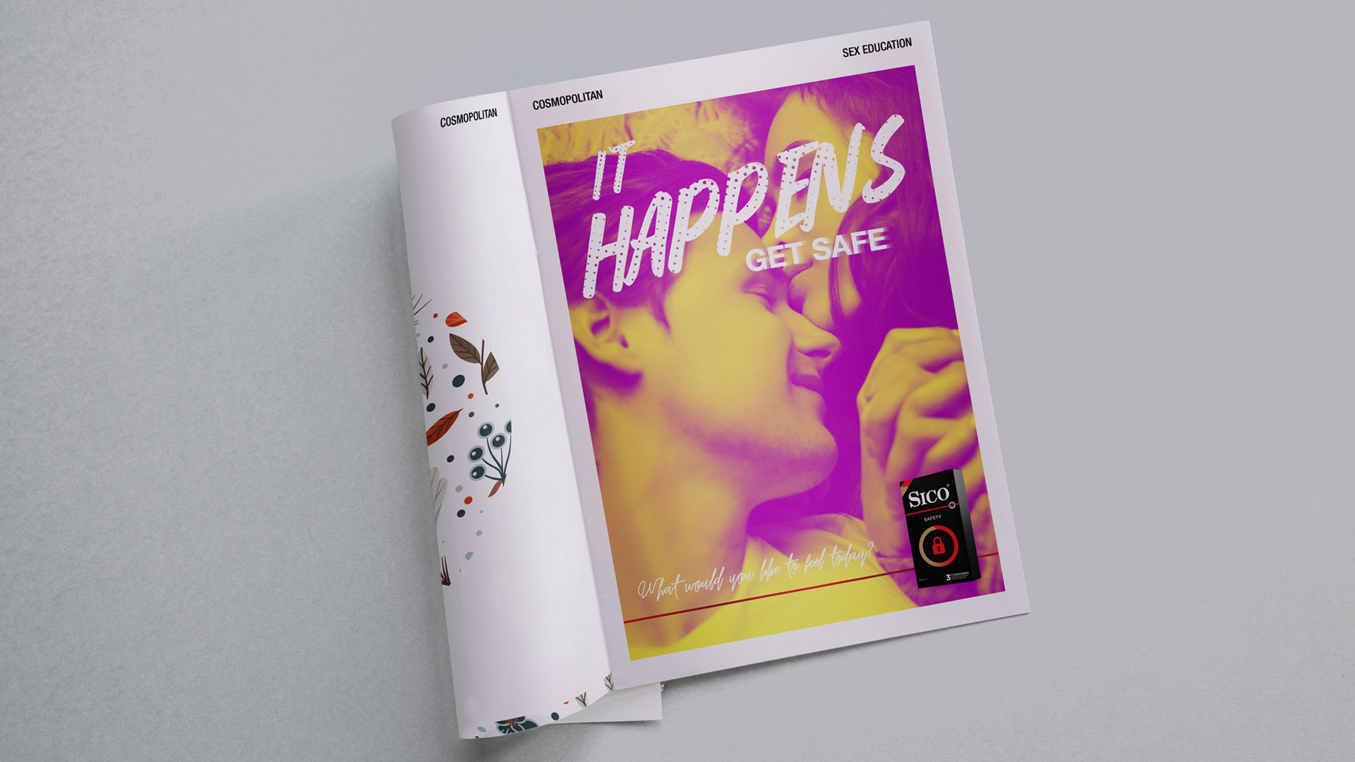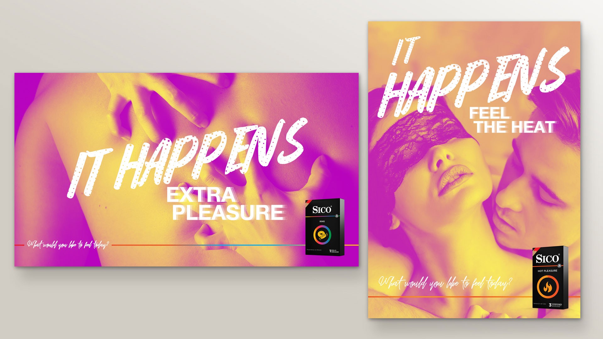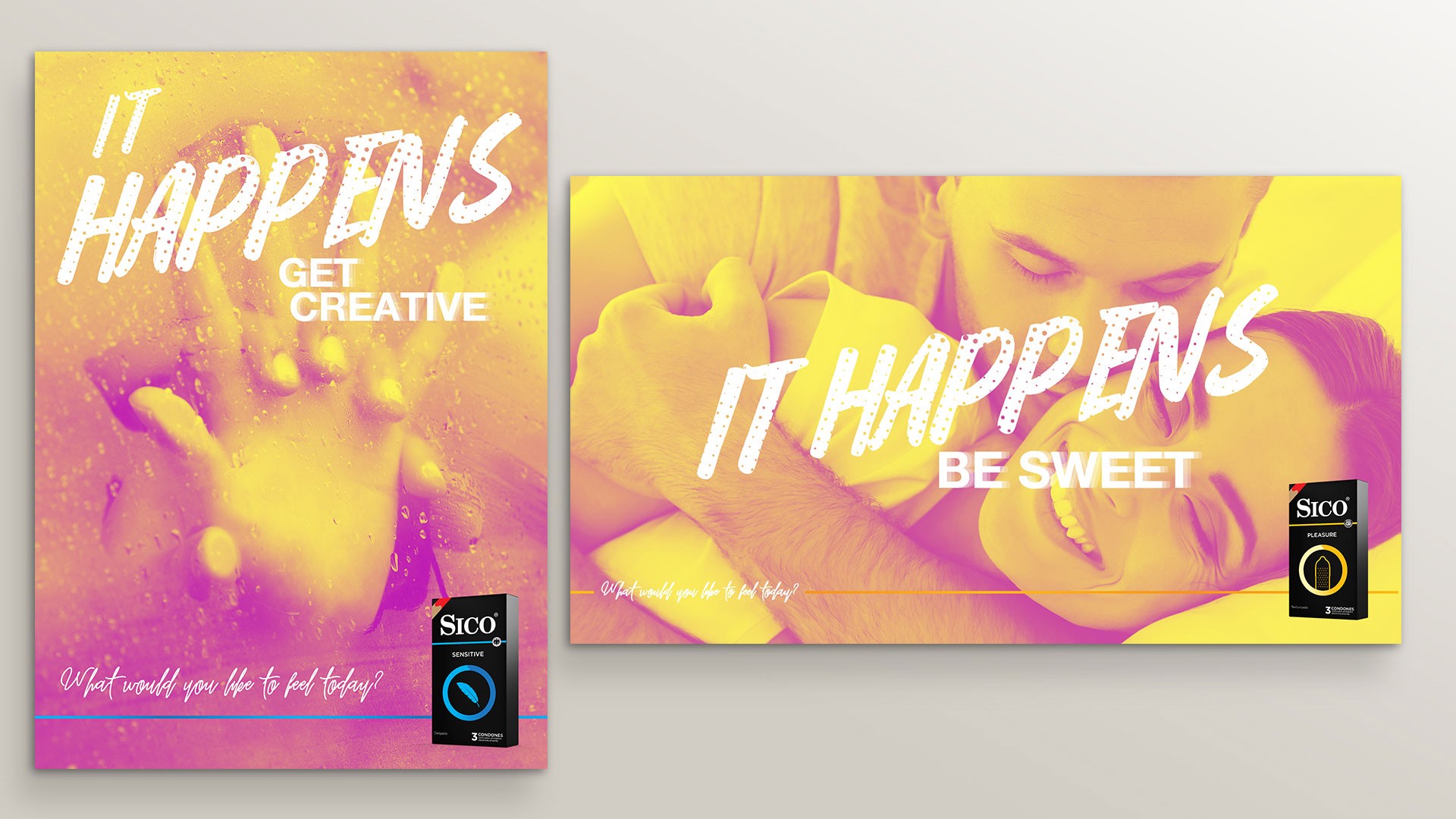For Sico, the goal was to remove the taboo and bring the brand closer to real life. The campaign “It Happens” turned moments of intimacy into bold, unapologetic expressions of confidence. The visual language used high-contrast duotones, playful typography, and vibrant gradients to capture the spontaneity of desire while positioning Sico as a brand that celebrates freedom, fun, and responsibility.