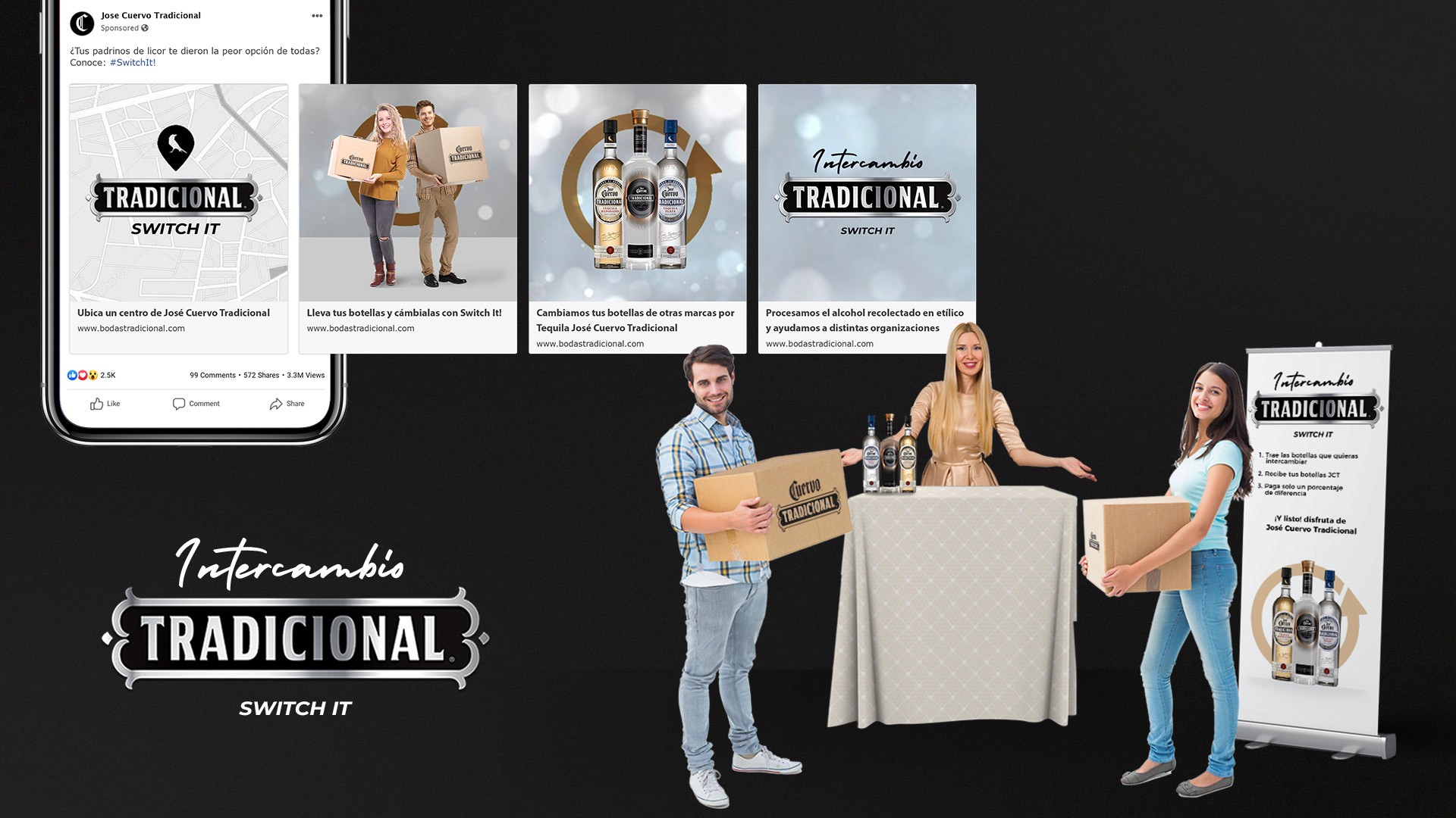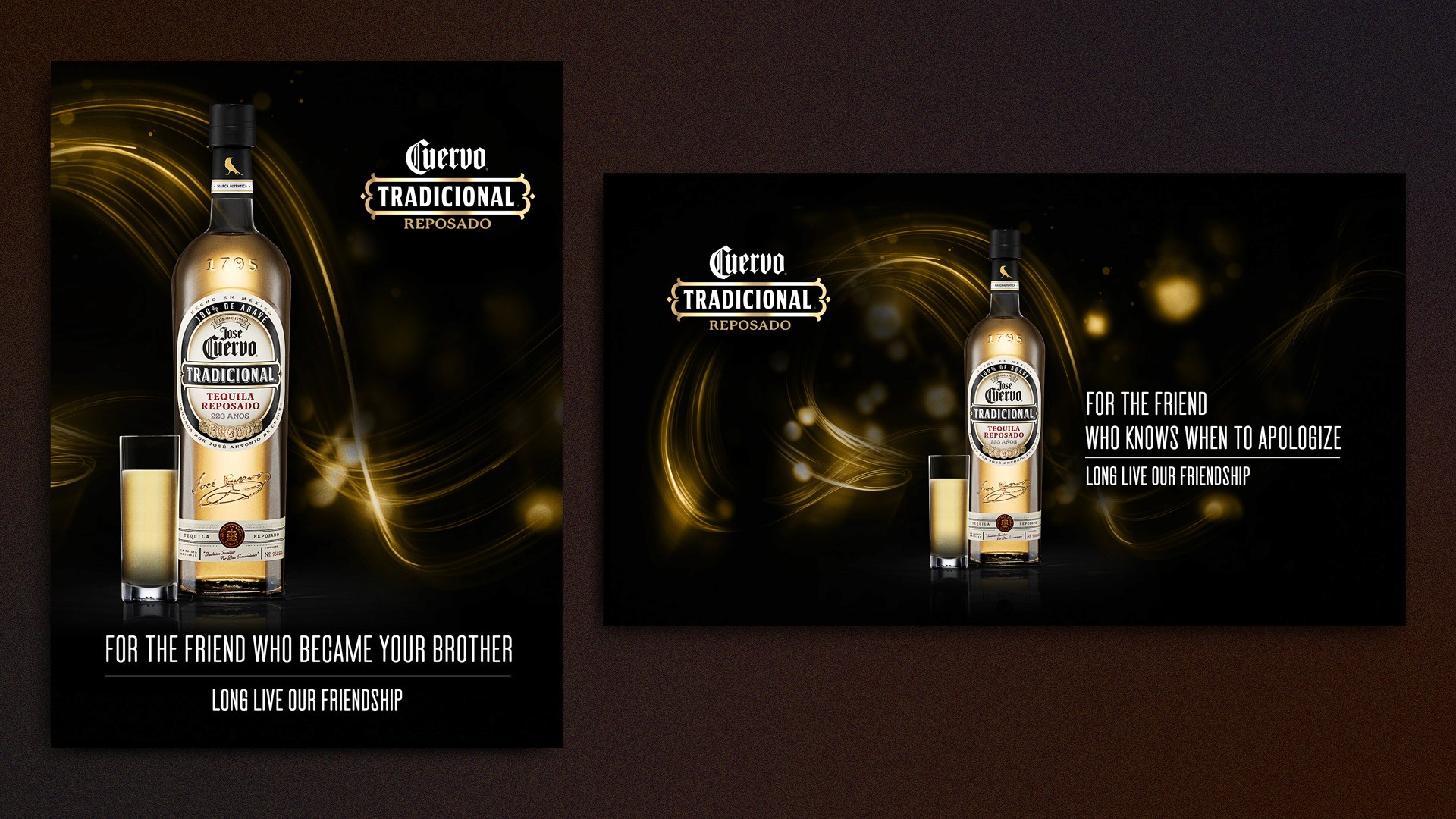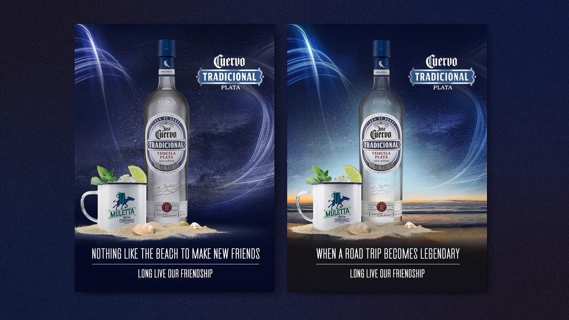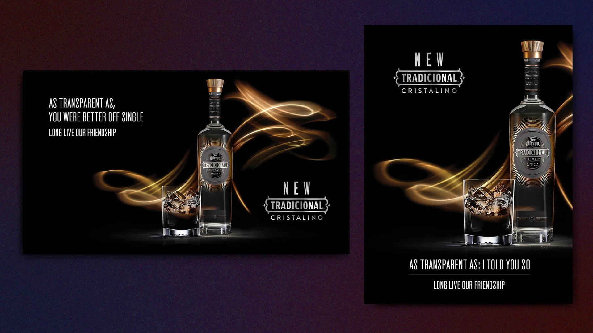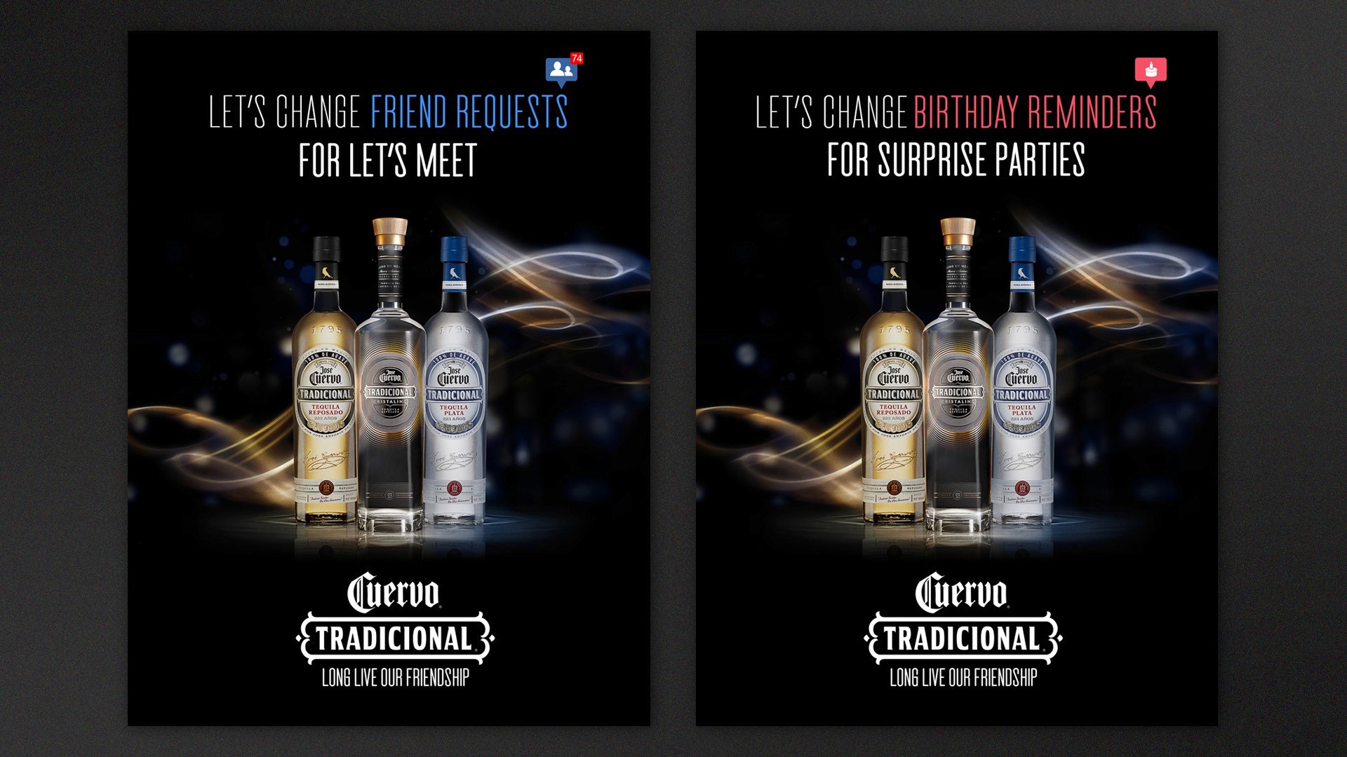 This campaign brought together the full Jose Cuervo Tradicional family — Reposado, Plata, and Cristalino — under one human message: reconnect offline. With copy lines like “Let’s change likes for hugs” and “Let’s change birthday reminders for surprise parties,” the visual direction captured the warmth of real connections, blending modern typography with elegant bottle lighting. Executed in subway billboards, out-of-home, and digital formats, the campaign used color-coded motion trails to distinguish each tequila variant while maintaining a unified, premium aesthetic.